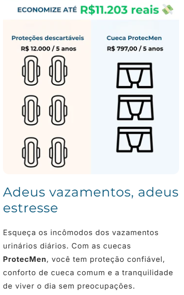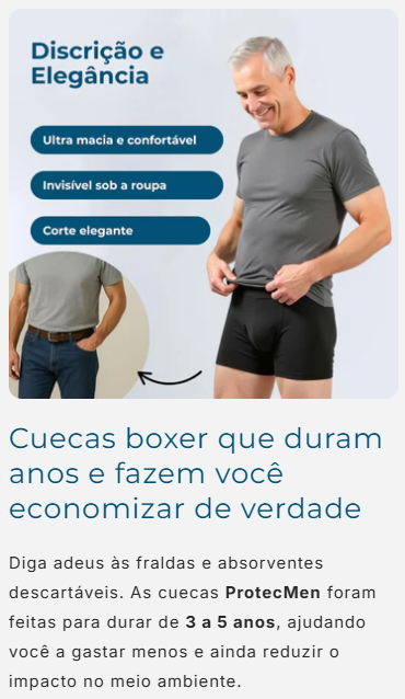 Eu evitava sair de casa por vergonha, mas oProtecMenmudou isso. Agora posso ficar horas fora sem medo de acidentes. Discreto, confortável e realmente funciona. Já indiquei para dois amigos.
